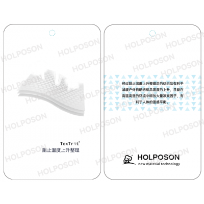 夏日炎炎,日光强烈,阳光是有能量的光线,其中包括远红外、可见光、紫外线等。深色黑色面料会吸收可见光并转化为热量,使深黑色面料升温速度高于白色浅色面料。HOLPOSON® COOL-COMBO是专为服装面料开发的阻止温度上升系列助剂,是由三种组分的助剂组成的温度上升整理剂,当纺织品面料曝光在阳光下时能屏蔽紫外线,并释放阻止温度上升因子,可以有效的降低面料表面的温度。