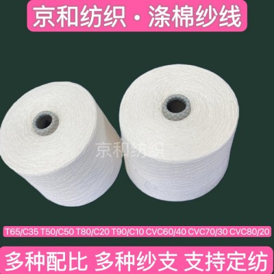 涤棉纱线条干好,毛羽少、挑三丝,适合针织、机织,用于做服装面料、针织汗布、针织起绒、针织毛圈、地毯合股之后用于做织带等。 常规支数有:6支—60支。涤棉纱常规配比是:t65/c35 t50/c50 t80/c20 cvc60/40 cvc70/30 cvc80/20等配比,可按客户要求订做反捻纱、竹节纱、合股纱等。