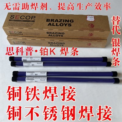 SECOP铂K焊条适用于焊接黄铜和铜合金、焊接铜和不锈钢、铜和铁。此产品的固相液相温度范围较窄,有良好的流动性,易于钎焊操作。SECOP铂K焊条是焊接铜合金较好的选择之一。它的熔点较低,相比较其他钎料能够降低铜合金在钎焊加热过程中的氧化程度。SECOP铂K焊条经常用来代替高银钎料,提高钎焊效率的同时有效降低焊接成本。由于钎剂与钎料的同时添加,SECOP铂K焊条焊条中的钎剂与钎料合金的配合更紧密,简化了钎焊助剂的转移和添加工序,从而提高钎焊操作的效率。