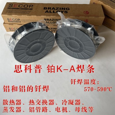 SECOP新研制的具有国际先近水平的铝药芯钎料铂K-A。该钎料焊接温度低,操作方便,可使用火焰钎焊进行焊接,不需另外添加钎剂,焊接接头强度高,密封性好,能钎焊铝—铝。是制冷空调冰箱、电机、变压器等行业实现铝代铜的理想焊接材料,具有节约资源、能源、等许多优点,能给用户带来的经济效益和社会效益。