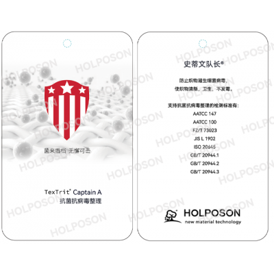 抗菌抗病毒整理剂HOLPOSON®CAPTAIN A具有耐洗的抗菌抗病毒材料,能有效抑制大肠杆菌、白色念珠菌、流感病毒H1N1,H3N2等,作用原理是阻止细菌病毒核酸合成,破坏微生物的代谢过程,终止其生长、活动和繁殖的能力。符合以下抗菌标准检测:ISO 20743-2007,AATCC 100-2004,JIS L1902-2008,GB/T20944.1-2007,抗病毒检测标准:ISO 18184 2014(E),主要应用于:家纺、服装、车内饰面料、医用防护等。