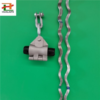 悬垂线夹 用途:ADSS预绞丝悬垂线夹主要用于架空自承式ADSS光缆线路上,作悬挂光缆之用,与普通悬垂线夹的作用相似。建议使用在线路转角≤30o时的环境。特点:1、极低的静态应力的合理分布,提高了动态应力(如振动或舞动)的承受能力,其握力可达光缆极限抗拉强度(RTS)的10%~20%。2、与光缆无刚性接触(柔性握紧),使磨损降至z低。3、优良材质使线夹有良好的弹性和韧性,极强抗疲劳性和防腐性,安全使用年限长。4、不仅有效地保护光缆,而且其平滑的轮廓外形使电晕放电及电磁损耗大大减小。组成:预绞丝悬垂线夹由内绞丝、外绞丝、橡胶夹块、悬垂夹板(壳体)等组成。用户可根据设计要求配置选购其它的连接件。