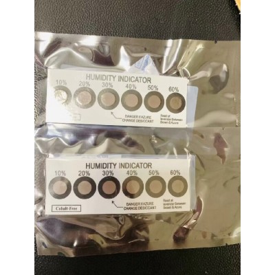 湿度指示卡可以很方便地检测出密闭包装里的相对湿度,是一种便捷而廉价的检测环境中的湿度是安全的方法。使用者可以通过卡片上面的颜色的变化迅速判断产品包装内环境温度情况及干燥剂的使用状况。如果包装中的湿度到了或者曾经到过该湿度值的话,卡片上的点就会从蓝色变成粉红色。可以估算出干燥剂的使用功效,以便及时更换干燥剂。